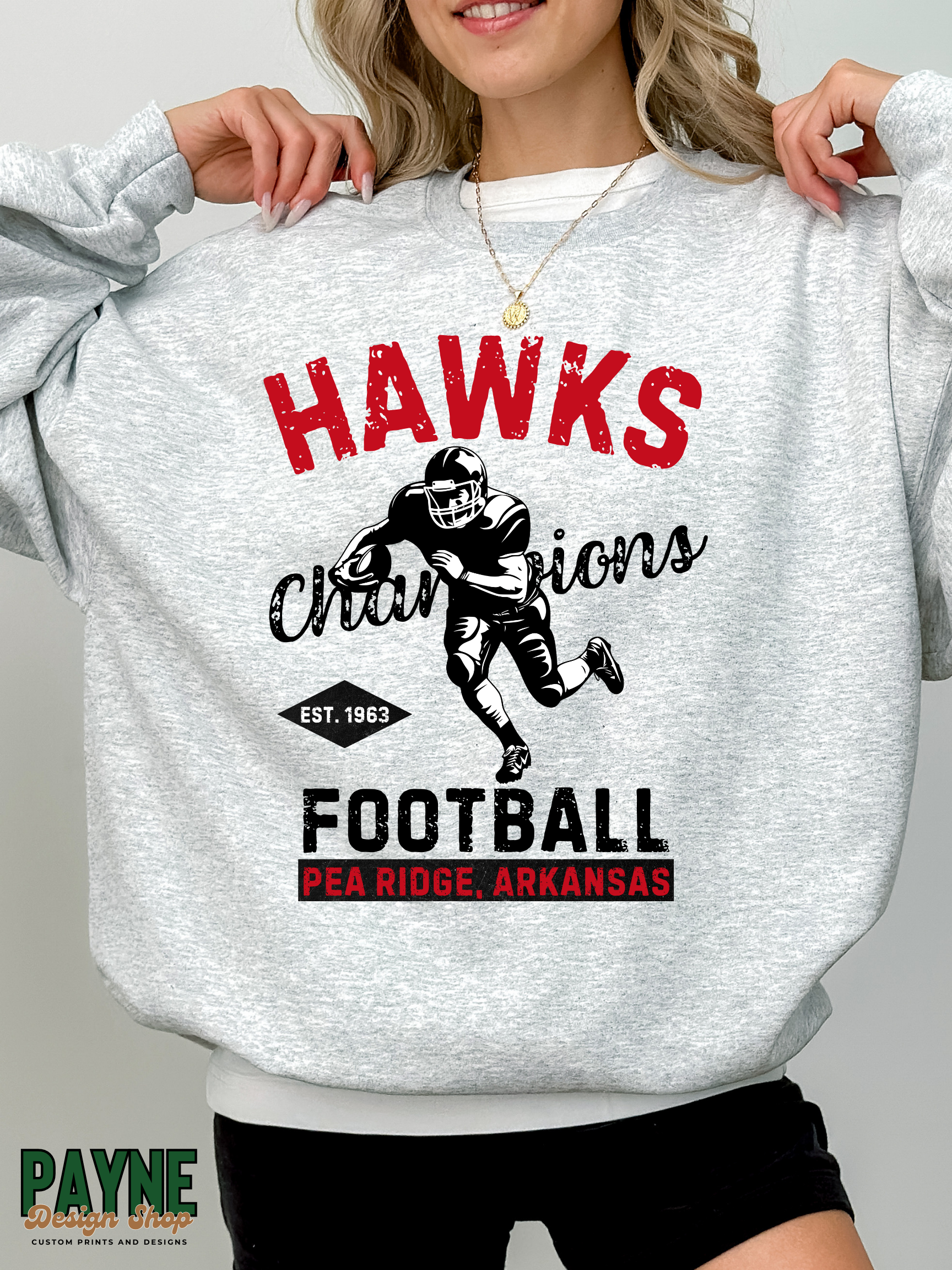 Hawks Football Champions Design. Available in an ash gray sweatshirt and on an ivory or pepper comfort colors tshirt.