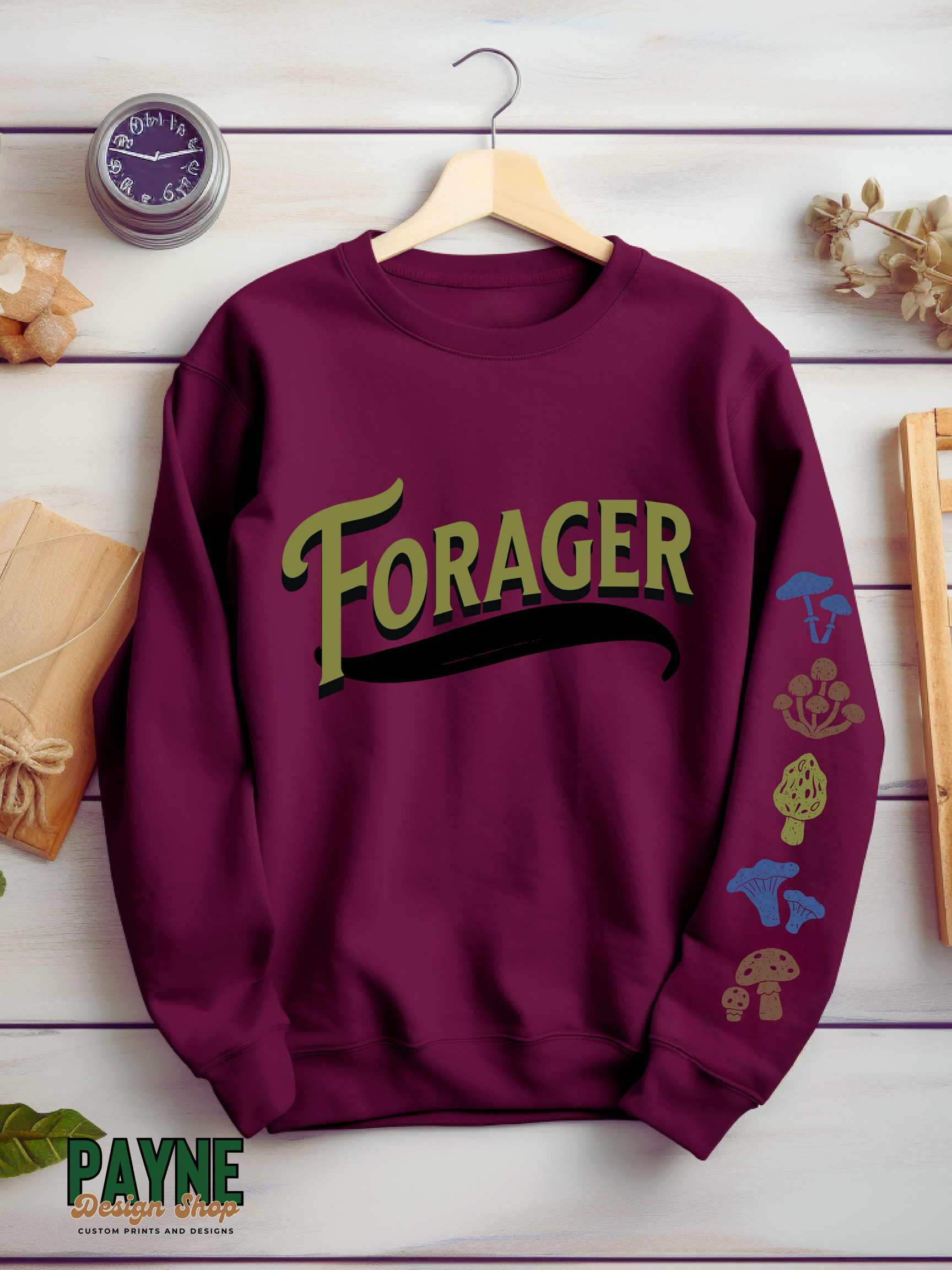 Forager Design. Available in tshirts and sweatshirts. Sweatshirts have the mushroom design going down the sleeve and tshirts will have it going down the back of the shirt.